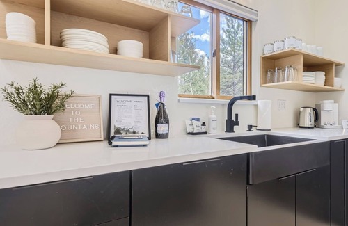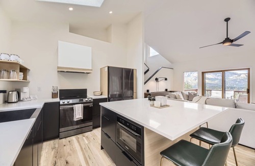 Sunlight pours through skylights and expansive windows, filling the home with natural light and highlighting the vaulted ceilings and wide-plank white oak floors. The gourmet kitchen features custom cabinets, quartz countertops, and top-of-the-line appliances including an induction stove and a cabinet-front Bosch dishwasher. Step onto the large deck to savor your morning coffee while watching the sunrise, or relax in the hot tub under a sky full of stars.