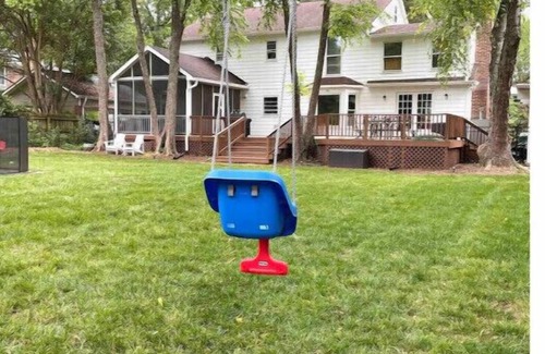 The backyard has multiple areas where you can relax and unwind. The in ground pool has a covered patio with fan to escape the heat and relax by the water. The pool is surrounded by trees which provide some shade in the morning and late afternoon. The pool is not heated, so it can primarily be enjoyed from Memorial Day through Labor Day. Outside of the pool safety gate, there is a huge backyard for kids to run around in while parents rest on the Adirondack chairs nearby. The yard is stocked with toys for toddler aged children. There is a massive deck which includes an oversized screened porch. There is a grill and dining space for six on the open air portion of the porch. While the screened in porch boasts couches to unwind on, as well as a smaller bistro table that accommodates four.