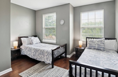 This modern & stylish 4 bedroom house features one all en-suite master bedroom with 1 queen bed and smart tv; One room with 1 full bed; One room with 2 twin beds; and a ground floor room with 1 queen bed and smart tv. It boasts a full kitchen with cooker and oven; washer and dryer; and 2 and a half baths, ensuring everyone's comfort & convenience. There is private parking for up to 3 cars including one garage space and sits on a corner plot with a beautiful lawn. All basic amenities are provided.