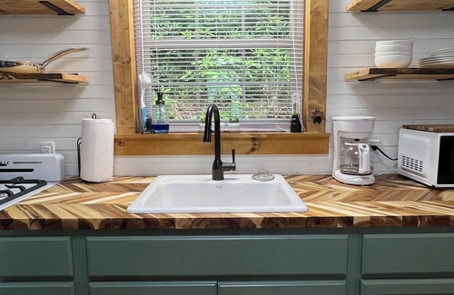 The living area has a large, flat-screen tv with Amazon Fire Stick so you can stream your favorite shows, Starlink Internet, and Verizon cell service. (Other cell phones may use internet calling/messaging with the wi-Fi.) Feel like a little jam session? We even put an acoustic guitar in the space you can harness your creativity when the moment strikes, or enjoy a book from our collection.