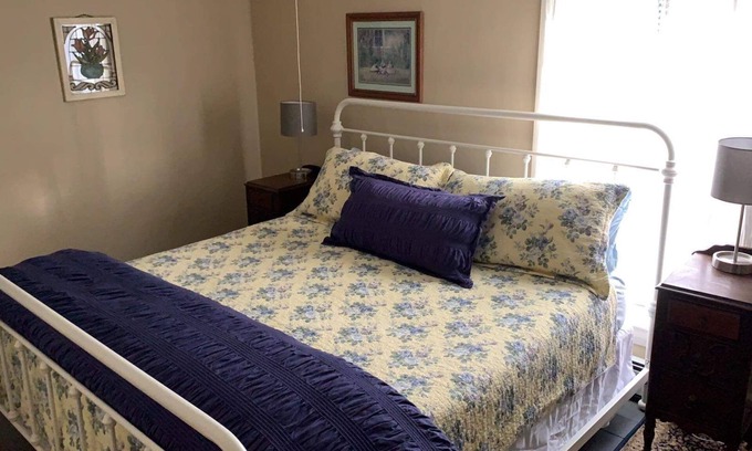 Bedrooms - The two bedrooms (one double bed, one king bed) are located on the second floor and include the standard amenities (bedding, dresser, night stand, lamps, closet, etc.) As with some older homes, the overhead light is on a pull chain and there are limited outlets but extension cords are available. The bedroom doors are original and fully close but do not lock.