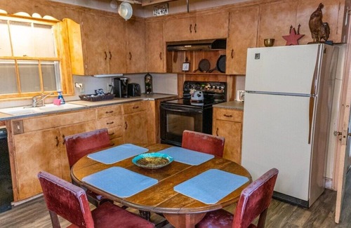The Farmhouse is one of the original homes at the Ranch, complete with a large wooden front porch and a tin roof. The Kitchen is well stocked with utensils to cook including an oven/stove, sink, refrigerator, and pantry. The Master bedroom features a queen bed and has a bathroom and a small rustic work area. A second room, with two sets of twin bunk beds, is located off the living area and also has an adjoining bathroom with a shower.