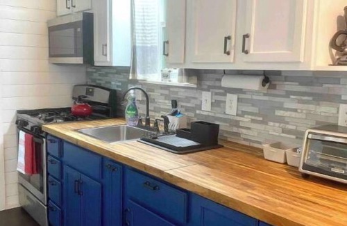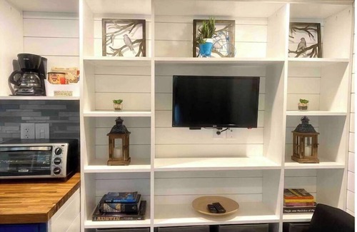 Welcome to your *tiny* home away from home! Recently updated, farmhouse chic, this is an adorable 8’ x 20’ lofted tiny home on wheels with its own outdoor deck. Set in a peaceful shared backyard with small in-ground pool. All the amenities you might need are available in this cozy space- including full kitchen/bath, mini split A/C/heat, Roku TV with Netflix/HBO Max, fast mesh network Wifi. Come experience tiny home living just a 15-20min drive away from the hippest parts of town.
