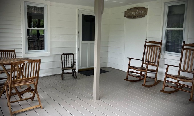 Quaint farmhouse restored with hemlock floors and vintage furniture. A relaxing front porch with a panoramic view of farmland and a tranquil pond.