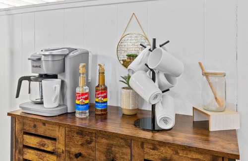 A homecooked meal awaits in a fully equipped kitchen, boasting butcher block counters, and an array of amenities including a combo Keurig coffee maker, blender, toaster, and Crock-Pot. For our tiniest guests, a kid's high chair and children’s cutlery ensure a great dining experiences for all ages.