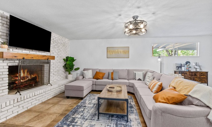 Stay at the best appointed VRBO in Abilene. Cozy living room fireplace, king beds, coffee bar, gas grill, outdoor firepit, pickleball, Xbox One and more are waiting!