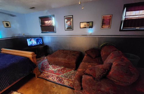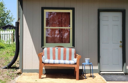 Complete with close outdoor Jacuzzi, comfy queen bed, boho kitchen, coffee bar, Netflix and washer dryer, among the amenities.