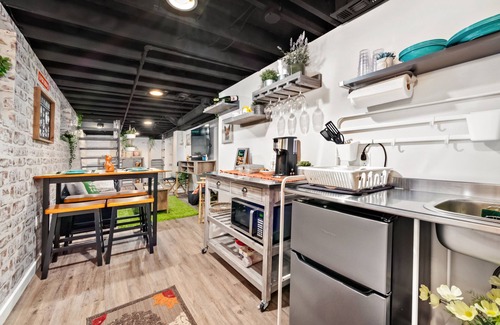 The Shaw Fox's Den is a finished basement suite - a clever (like a fox) space that offers a private bedroom with a luxurious queen sized memory foam bed and 32” smart TV, a separate living-room space with 50” smart TV and a small full-size (73” x 46”) pull out sofa bed (w/ memory foam topper) that can sleep one easily or up to two (snuggly), full kitchenette area with mini-fridge/microwave/sink/tea-coffee maker (with tea & coffee provided), dining table that seats 4, full bathroom with shower and a small fold down vanity table w/ lighted mirror, closet/dresser/storage in bedroom, multiple fast charging USB power outlets, and a private entryway into the space.