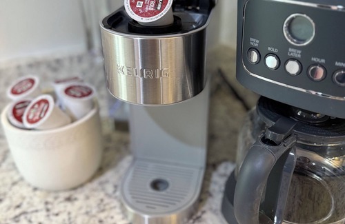 ✔ Fully Equipped Kitchen – Stainless steel appliances, cooking essentials, Keurig & regular coffee makers