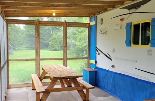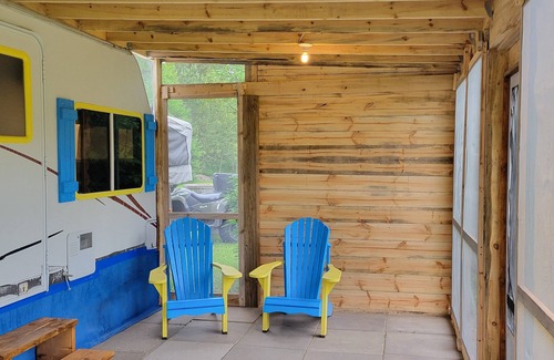 A private lot with a converted RV that sleeps 2 queen size beds, and a second building, a small bunky that also sleeps 2 queen sized bunk beds. Screened in deck on a patio with picnic table, Walking bridge over part of the lake, a Raft available for leisurely paddling , a fire pit, new BBQ, peaceful tranquility, retreat, small trails. Clean water for swimming, dive off the dock or a wading area for kids. A birders paradise, stargazers or artists retreat. Small fish in the lake for fishers (catch and release) Relax!