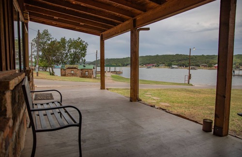 Large covered patio with views of Possum Kingdom Lake.