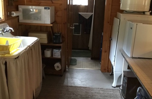 Through the front door there is a bed , hid a bed, wood stove, 2 chairs . Walk into the full kitchen fridge, freezer, stove, oven, table & 4 chairs. The bath is to your right, toilet, sink & shower. Out back a BBQ & fire pit.... The cabin was built in the 1800's it was a Forest Cabin for men working in that area. Across the road is The West Fork River, up ythe road is Painted Rocks Lake & Lost Trail ski area is a common destination.