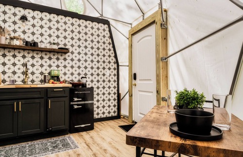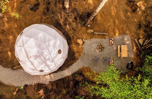 This tranquil dome in Robbins is a delightful retreat for guests looking to unwind. It is a ONE OF A KIND glamping dome, with a cozy bedroom, WiFi, AC, heating, and more. This pleasant space offers everything you need for a relaxing retreat into nature. Whether you're curling up with a book or exploring the surrounding nature, this dome is the perfect escape. This is a one of a kind experience, unlike anything else you've encountered!