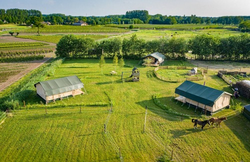 Hoeve Klein Haneveld is a small-scale glamping location located in Sint-Oedenrode, near Liempde, in the province of Noord-Brabant. At this farm campsite you can enjoy luxury safari tents that are fully equipped for up to four people. The tents have a veranda with awning, a fully equipped kitchen and two sleeping cabins with comfortable box-spring beds. The beds are made upon arrival and bed linen and towels are included. Dogs are welcome in the safari tents, in consultation. One of the unique features of Hoeve Klein Haneveld is the playground that is centrally located between the tents. This playground is clearly visible from the verandas of the tents, which makes it ideal for families with children. In addition, the chickens walk freely around the site, which contributes to the rural atmosphere. The area offers plenty of opportunities for cycling and walking tours. In addition, cities such as Eindhoven and 's-Hertogenbosch are a short drive away, as are attractions such as the Efteling and Beekse Bergen.