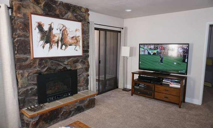 The Living Room offers a pull out couch, sitting chair, New Gas Fireplace insert that is toasty warm, 55' smart TV, DVD player and Bluetooth Speaker. Nice Dining Room Table and chairs accompany the room. Fun Sun Valley Valley artwork and some beautiful paintings.