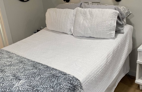 The guest house has Wi-Fi and a wall mounted TV for streaming your favorite shows. The kitchenette is equipped with dishes, utensils, cups, pans, a coffee pot, a cooktop, a full size refrigerator with ice maker, a microwave and a toaster oven. The bathroom includes a vanity sink, toilet, shower stall and a separate heater for chilly mornings. Extra towels, linens, blankets and toiletries are available on the bathroom shelves.
