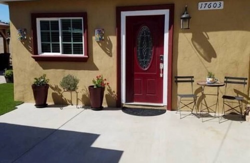 Fully furnished private guest-house in established, quiet neighborhood. 500 sf of coziness ready to welcome you! Full kitchen with stove, oven, microwave & dishwasher; full-size washer & dryer; full bathroom with tiled shower; 2 comfy beds - 1 queen & 1 twin/single; safe for valuables; a/c, heat, electric fireplace for cold nights. Cable TV, your own WiFi. Separate entrance. Close to CSUN, shopping, restaurants & Metro. Perfect for the biz traveler - your home away from home!