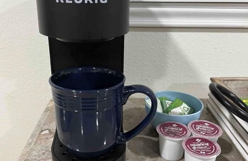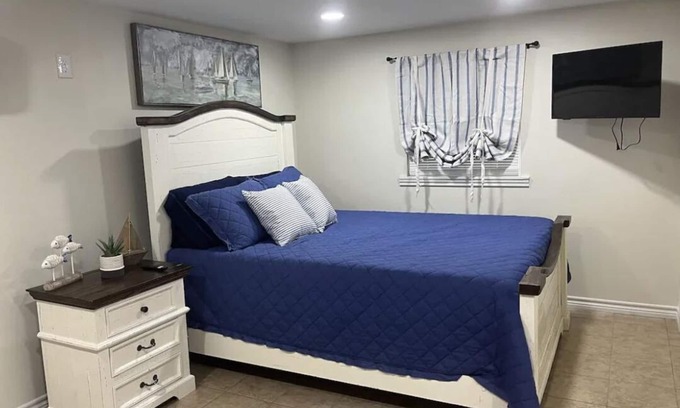 The Coastal retreat themed guest house includes a regular size kitchen with full refrigerator, sink, oven/stove, dishes, pots, and microwave. There is a Keurig coffee maker, toaster, and blender. There is a bathroom with shower and tub, Queen sized bed, a couch, TV, AC, 2 small chests with 3 drawers each. A closet with a clothes rack. A small dinner table and 2 chairs.