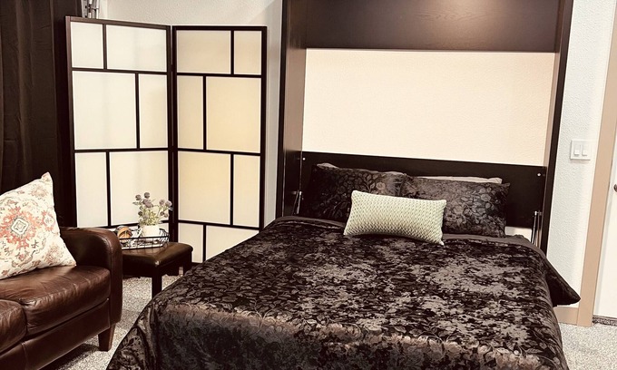 Welcome to our new elite, transform studio guest suite. It’s equipped with a full-size refrigerator, a toaster, oven, a microwave, and a sleek, stainless steel sink. A complete bathroom, featuring shower and LED mirror with defrost function. Sleep comfortably on a queen size Murphy bed, dressed in luxurious linens. You can relax on the leather sofa and watch TV. The suite has its own independent heating and cooling system, giving you total control over the temperature,