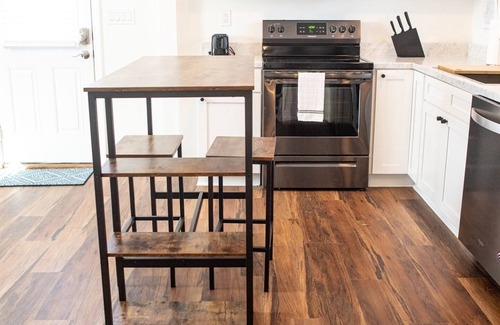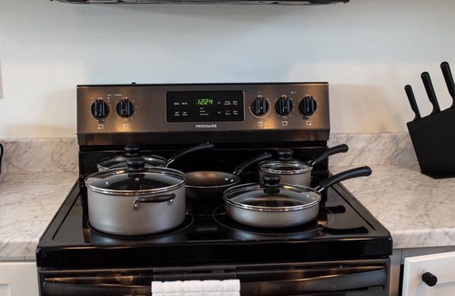 The large shower and soaking tub are ideal for winding down. The flat screen TV rotates so you can watch from the couch, bed, or even kitchen. Kitchen comes with all the essentials. In short, the place has all the amenities for a great stay--long or short term.