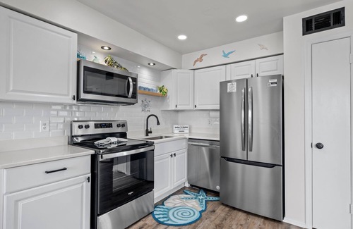 Wake up to the sound of waves and enjoy your morning coffee on the private balcony. Inside, you’ll find a beautifully refreshed space with sleek, contemporary décor, a comfortable queen bed plus a sleeper sofa, a fully equipped kitchen, and Smart TVs in both the living room and bedroom so you can stream your favorite shows anytime. Plus, enjoy the convenience of an in-unit washer and dryer—perfect for extended stays or freshening up after a beach day!