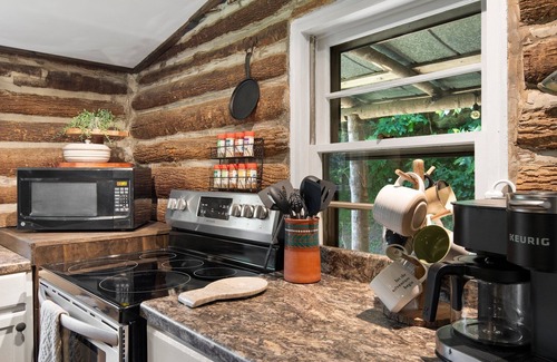 •The heart of the cabin is the cozy living area, where a wood-burning stove adds a touch of rustic charm. Enjoy the warmth and ambiance as you relax with loved ones in the comfortable seating area. Firewood is provided.