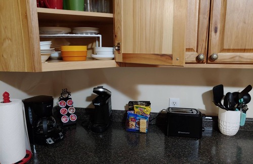 The kitchen is well stocked with dishes, cookware, microwave, coffee pot and toaster.