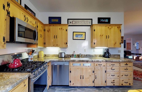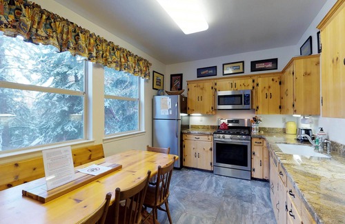 This home offers a cozy, welcoming escape for outdoor enthusiasts. Begin each morning by flipping pancakes in the full kitchen, bring the newspaper outside to read on one of the decks, and use the free WiFi to find a new hiking trail or two. Come wintertime, you can leave your skis and boots on the covered deck, curl up with a good book on the sofa, or catch a favorite movie on TV as the snow falls through the pines. You can even start a load of laundry in the washer/dryer while you relax. There is room for the whole family to enjoy a serene getaway!