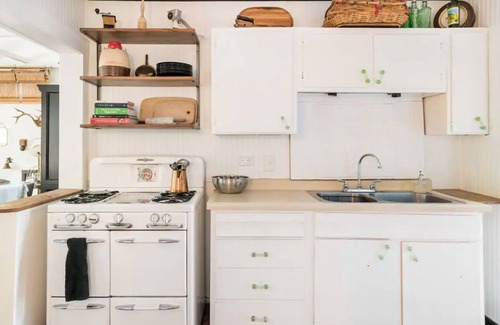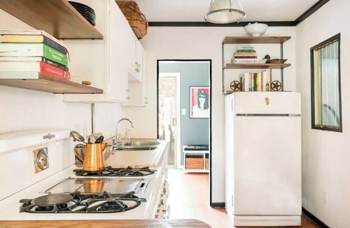 Built in 1906, this is a turn of the century 1 bedroom, 1 bathroom house on a stand alone property. An indoor & outdoor fireplace, wood beams, refurbished antique stove, antique refrigerator, washer and dryer make the cabin a charming space that feels like a hillside cabin getaway in the middle of the city.