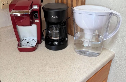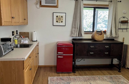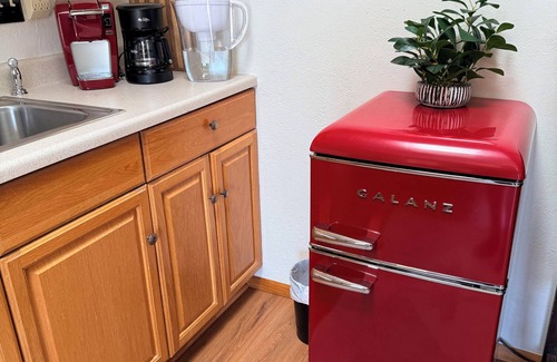 The snug kitchenette is adorned with a sink, a toaster oven, a hot plate and a drip and Kuerig coffee maker, and a mini fridge/freezer, inviting culinary creativity. To preserve the tranquil ambiance of our sanctuary, the unit is intentionally devoid of a TV and microwave. Nearby, delightful shopping and dining treasures beckon, and we've curated a collection of splendid recommendations for your exploration.