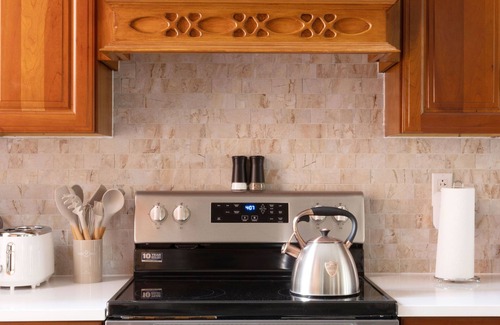 The updated bathroom has a lovely walk in shower with complimentary shampoo, conditioner, and body wash. The kitchen is equipped with all the amenities you might need to cook during your stay. It also offers 3 different varieties of coffee, sugar, and creamers for the perfect cup of coffee in the morning.
