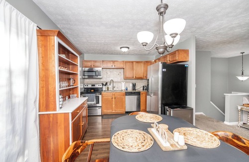 Heading indoors, you’ll find plenty of private spaces for the group to spread out while still presenting opportunity for connectivity and creating lasting memories. The cozy living room offers a comfortable sofa and smart TV for hours spent streaming your favorite entertainment. A few steps away and you’ll be in the dining room, where a chic table and chairs set can seat 4 for formal meals or to host an electric family game night. The kitchen is well-equipped, offering stainless steel appliances, stone countertops, and ample cabinetry stocked with all your mealtime necessities. Drip and Keurig coffee makers are available for brewing up your morning cup, and you’ll have your choice of prime locations to enjoy it indoors or out. Escape for a quiet hour alone to the den on the lower-level and lounge back with a good book or perhaps even to sneak in an afternoon nap.