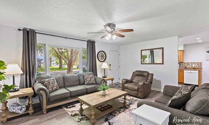 Comfortable and tastefully decorated 3 bedroom home in Bourbonnais. This home is on a quiet street and has a big fenced in backyard. The living room has a 65 inch smart T.V. The eat in kitchen has all the amenities to prepare a home cooked meal. The kitchen appliances include electric stove, microwave, refrigerator and dishwasher. You will find plenty of dishes, pots and pans, silverware, and eating utensils for your use. If you decide to cook outside on the back patio there is a Weber charcoal grill with charcoal, charcoal lighter fluid and lighter. The master bedroom has a 55 inch smart T.V. and a super comfy king size bed with king size hotel pillows. Bedroom #2 has a 55 inch smart T.V. and a king size bed along with king size hotel pillows. Bedroom #3 has a comfy queen size bed with hotel style pillows. We also supply a queen size deluxe electric air bed with extra sheets and pillows. For the little ones we have a pack-in-play and high chair in the home. There is also a laundry room for your use with complimentary laundry detergent. The Perry Farm Park is nice bike ride or drive by car away. The park has a awesome park with bike and walking trails. Pictures of the park are in the home description pictures . In the garage you will find bikes for all ages for you to enjoy.
