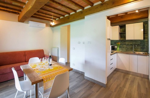 Relax near Castel Focognano in this high-quality and inviting residential complex with several vacation apartments. Step into the comfortable vacation apartments, which differ slightly in size and color scheme, but offer you and your loved ones a home away from home. Enjoy the beautiful furnishings, some on two floors, and, depending on availability, take advantage of the opportunity to spend your vacation here with your extended family or family friends.
