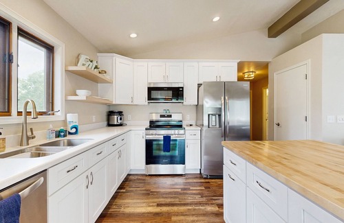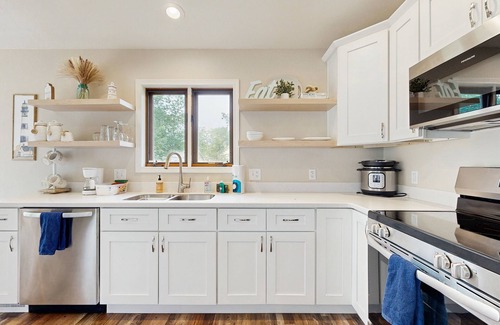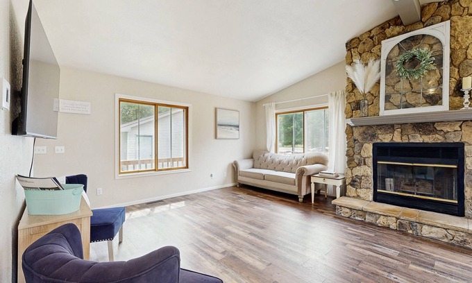 Step inside and be welcomed with fresh linens, basic supplies, and the added comfort of central air conditioning and heating to make your stay cozy in any season. The living room is equipped with cable TV and high-speed Wi-Fi, while the kitchen offers everything you need to cook at home, including a full-size fridge, stove, microwave, dishwasher, and dining space. Step outside to enjoy your morning coffee or grill up dinner on the private patio. After a day of fun, toss your clothes in the in-unit washer and dryer and settle in with one of the provided board games for a relaxing night in.
