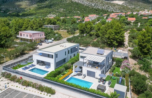 This stylish holiday home with its own pool is in an excellent location. It is close to the marvellous Trstenica beach with fine sand and pebbles. On the ground floor you will find a large kitchen and living room, bedroom with bathroom en suite and an additional toilet. Internal stairs lead to the 1st floor, where there are three further bedrooms with en-suite bathrooms and a leisure room. From one bedroom you can access the beautiful balcony with marvellous sea views. Outside you can refresh yourself in the pool and relax in your own whirlpool and sauna, while the children have fun in the play area.