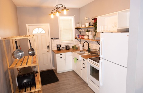 local restaurants, and entertainment! Our historic house is fully furnished and equipped for your travel. Fully stocked kitchen, fresh linens, on-site parking, and a very comfortable Queen bed! Your home away from home.