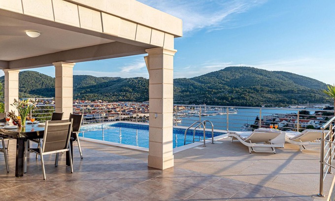 This wonderful holiday home is located in the beautiful town of Vela Luka, on a hill with a breathtaking panoramic view of the entire bay. The large terrace with swimming pool in front of the house is an ideal place to spend convivial moments barbecuing with family and friends, while the tastefully furnished interiors complete the pleasant comfort. Discover the marvellous landscape of the island of Korula and visit the birthplace of Marco Polo. A trip to the popular beach on the island of Proizd is highly recommended.