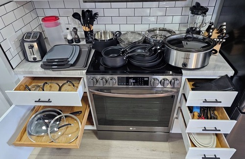 Basement: The lower level houses two cozy bedrooms with premium memory foam mattresses, blackout curtains for restful sleep, and thoughtful decor. The master bedroom features a luxurious king bed, while the second bedroom offers a comfortable sleeping arrangement for guests. A full bathroom and an in-unit washer and dryer make extended stays a breeze.