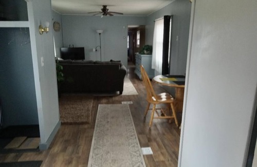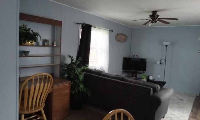 Newly remodeled 2 bedroom 1 bathroom home. Large living room, work area with desk, dining room and a full kitchen. Fully furnished includes: heat, air conditioning, water, sewer, electricity, WIFI, TV with Hulu Netflix Paramount Starz Disney You tube Peacock , washer/dryer, microwave, coffee maker, gas stove/oven, refrigerator, cooking/eating dishes and utensils, outdoor back porch with seats and table viewing the 6 acre property with woods stream and walking paths, and much more! Many more pictures available so if interested, please connect and they can be sent!