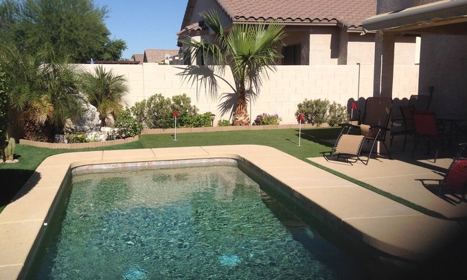 With the beautiful Arizona evenings, you may want to venture outside to the patio to enjoy the sunset while you barbecue. The patio has a retractable awning to shade the hot afternoon sun. You may want to take a dip in the heated pool (extra fee) while preparing dinner or practice your golf on the putting green.