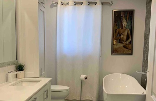 As you settle into this 3-bedroom, 2-bathroom rental, you'll find a living room, air conditioning, and a desk. Bathroom amenities include a hair dryer, a bidet, and towels. Prepare a home-cooked meal in the kitchen, complete with an oven, a stovetop, and a refrigerator, as well as a coffee maker, an ice maker, and a microwave. And you won't have to pack extra clothes, because you'll have a washer and dryer, too.