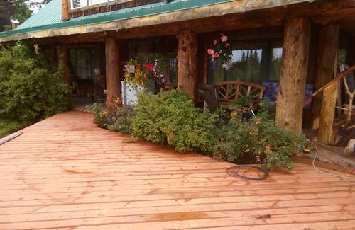 Our hilltop B and B sits on 17 acres of gardens and woodlands and offers a distinctly Alaskan experience. The house is log and cedar shake with big porches, from which to admire sweeping views. Mt Redoubt and Cook Inlet are visible. We offer a hot breakfast before you leave for your busy day. The kitchen, decks, living and dining areas are available for your evening relaxation. We have a fish cleaning area and freezers, and even a plywood smokehouse, should you choose to smoke your catch.