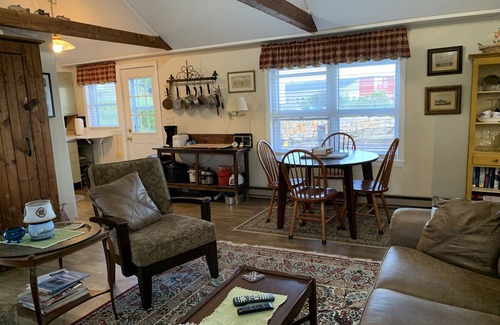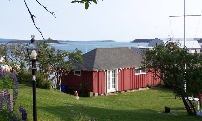 Relax literally cove side in this adorable and cozy cottage with close up views of Stonington Harbor, distant islands, and the active harbor vista of lobster boats, schooners and kayakers just outside your windows. The cottage interior offers a light-filled, open plan with beamed cathedral ceilings adding to a spacious feel. The simple yet well equipped kitchen opens to the living/dining area. The bedroom (queen bed) is off the living room (additional LR queen sleeper sofa, too). The bathroom has a spacious walk in shower. The cottage is water facing on two sides, and nice grassy yard and stone patio. Including the lot above, the setting provides one of the larger intown, waterfront properties on Stonington Harbor, with incredible views, and ample parking, too. A small footbridge crosses to the owner's adjacent property (Vrbo 30315) with easy access to kayaks and shorefront. With the harbor and array of nearby islands to explore, this property offers exceptional kayaking. Note: While there is an added sleeper sofa to accommodate a party of 4, the more open design of the cottage works best for 2. Likewise, there are steps leading to the cottage. Not appropriate for the infirm. Proximity to ocean and seawall makes it unsuitable for toddlers or young children.