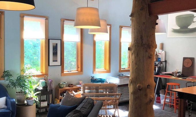 The barn is a multi-use building with a work shop on one end, our design/marketing office on the other. In the center is a general studio/work space with very comfortable sitting area, bed loft, kitchenette and 3/4 bath. Plenty of room to stretch out. TV, music system, high speed wi-fi is included. Each section of the barn has its own exterior entrance as well as interior access that can be closed off. Lots of privacy. The outdoor area and amenities are shared with those in the house.