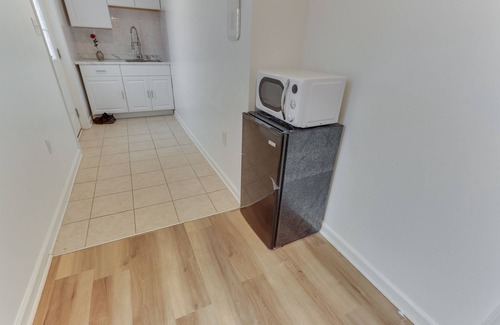 KITCHENETTE: Refrigerator, dishware/flatware, cooking basics, drip coffee maker, microwave