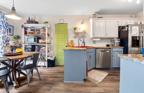 Bring the whole family to this peaceful cottage in the heart of Jenks, where comfort and togetherness come first. Each room is designed to feel inviting and cozy, with soft linens and beds that make it easy to relax. The home includes a spacious King bedroom, a comfy Queen, and a playful bunk bed with a slide the kids will love.
