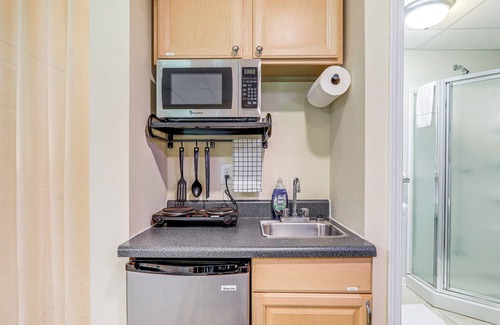 KITCHENETTE: Refrigerator, hot plate, microwave, toaster, Keurig coffee maker, complimentary coffee, tea & snacks, dishware & flatware, cooking basics, trash bags & paper towels