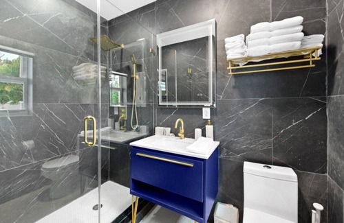 Your private spa oasis features a stunning black marble walk-in shower with gold rainfall fixtures, a navy vanity with ample storage, and elegant lighting.