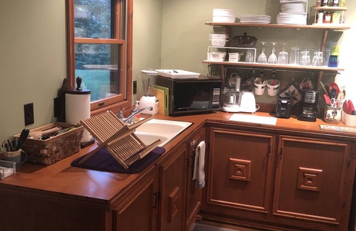 This is a very comfortable 2-bedroom, 1 bath cabin on stilts that enables views of the lake when some of the leaves are down. The living area, dining table, and kitchen are in one room with cathedral ceilings. There a big umbrella on the deck as well as 4 comfortable patio chairs and a table. The cabin has central A/C and heat, plus there are ceiling fans in the great room and bedrooms and an oscillating heater and window A/C in the garage. The kitchen is extremely well equipped for cooking favorite recipes. We are located extremely close to the Commons Area for access to the lake. It is a peninsula that juts out into the lake so the views are great, and we're directly across the lake from Lake Anna State Park, which has the best swim beach on the entire lake as well as a boat ramp to launch your motor boat or jet ski. It's only a 7 minute drive from our cabin to the state park. A washer and dryer (in garage) are also available to use. The Vintage Games: Foosball and Bumper Pool tables, Bucket Corn Hole, Legos, Hacky Sack, Hula Hoop, Badminton, etc. are in the garage. Sitting and/or eating on the deck is very comfortable. You may see fox or an owl and we have binoculars on the bookcase to birdwatch.